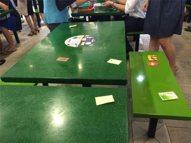 Không có gạch để giữ chỗ? không thành vấn đề! Người Singapore đã nghĩ ra cách dễ dàng mà tiện lợi hơn là dùng giấy ăn để giữ chỗ. Nhiều người tự hỏi "thế nếu đấy là giấy ăn thừa của người trước thì sao?", chắc cái này thì chỉ có người Singapore mới hiểu nhưng bạn cũng không nên đụng vào các chỗ đã có giấy ăn đặt ở trên.