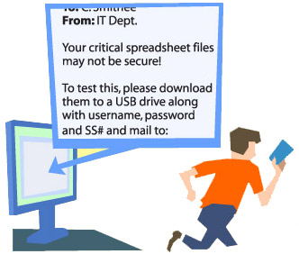 "File quan trọng của bạn có thể chứa mã nguy hiểm. Để kiểm tra điều này, hãy sao chép nó ra một ổ USB cùng với tên, mật khẩu và mail cho chúng tôi...". Người sử dụng chắc chắn biết rằng họ không nên tải dữ liệu gì nhạy cảm vào ổ lưu trữ nhỏ gọn như USB vì rất dễ mất. Hơn nữa, chẳng ai dại dột gửi thông tin đó đến e-mail lạ.