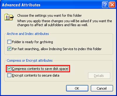 Để sử dụng chức năng này bạn vào My Computer / Computer, chuột phải vào thư mục bạn muốn nén dữ liệu rồi chọn Properties sau đó nhấn nút Advanced để hiển thị cửa sổ trên.