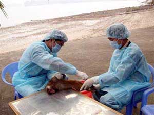 Các nhà khoa học đang tiêm vắc-xin H5N1 vào khỉ tại đảo Rều, Quảng Ninh |