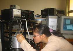 Một nhân viên thuộc Phòng thí nghiệm của Viện Vật lý ứng dụng và thiết bị khoa học đang cho mẫu vật vào kính hiển vi quét đầu dò |