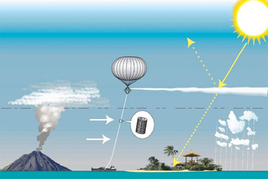Nhà khoa học thuộc Đại học Bristol của Anh muốn làm được cái mà núi lửa Pinatubo (Philippines) đã từng gây ra, vụ núi lửa này bùng nổ vào năm 1991 đã làm cho nhiệt độ trái đất giảm nửa độ C vì tro núi lửa bốc lên tới tầng bình lưu và che ánh nắng mặt trời. Watson cũng muốn thổi lớp tro bụi lên tới tầng bình lưu thông qua một cái ống gắn vào phần cuối một quả cầu hellium khổng lồ lên đến độ cao 20km. Một tầu thuỷ chạy trên biển là cơ sở phục vụ cho toàn bộ quá trình này.