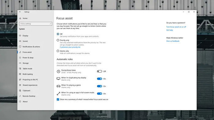 Trên Windows, kích chuột phải vào Start -> System -> Focus Assist để thiết lập lại thông báo cho từng ứng dụng ở chế độ không làm phiền, sau đó tiến hành kích hoạt nó tại trung tâm thông báo (Action Center) bằng cách kích chuột phải vào biểu tượng thông báo -> Focus Assist.
