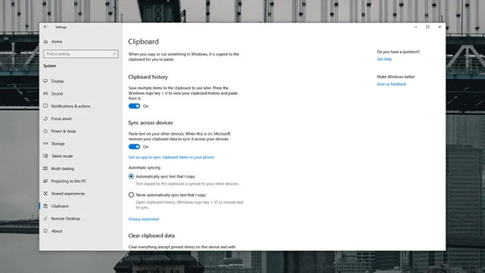 Trên Windows, nhấp chuột phải vào menu Start -> Systems -> Clipboard để bật tính năng đồng bộ hóa các dữ liệu được copy và paste giữa các thiết bị khác nhau (liên kết với nhau bởi Microsoft ID). Bạn cũng có thể kích hoạt tùy chọn bộ nhớ tạm để lưu trữ một số tệp tin từ đây.