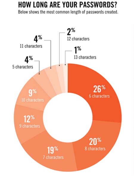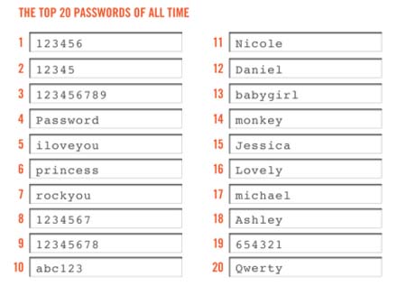 Theo bảng xấp hạng trên có thể dễ nhận thấy 3 thứ hạng cao nhất đều thuộc về số thứ tự từ 1 đến 5, 6 hoặc 9. Có đến 4% tổng số người được khảo sát dùng chính từ "Password" làm mật khẩu. 25% số mật khẩu trong bản xếp hạng trên dùng riêng và 16% dùng chính họ của mình để đặt mật khẩu cho dịch vụ đang sử dụng (Ví Dụ như : Nicole, Michael, Jessica...). Sự thông dụng và dễ dàng quá mức đã đem lại các cơ hội hành nghề tuyệt vời cho các hacker bất chính.