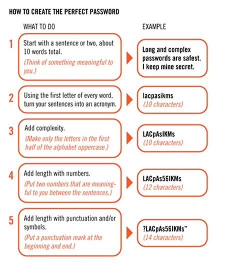 Hãy dùng một hoặc hai câu ngắn khoảng 10 chữ và thật dễ nhớ đối với bạn. Sau đó kết hợp các ký tự đầu của mỗi chữ trong câu lại với nhau. dùng phím CapsLock một cách ngẫu nhiên để tạo chữ lớn nhỏ và gia tăng độ khó cho mật khẩu. Cuối cùng không quên thêm vào một ít ký tự đặc biệt, vài số đếm... Thực hiện theo những chỉ dẫn kể trên bạn sẽ tạo được một mật khẩu tuyệt vời cho mình và các hacker cũng sẽ vô cùng khó khăn nếu muốn xâm nhập vào tài khoản cá nhân của bạn. Thêm một lưu ý nữa là không phải ký tự đặc biệt nào cũng có thể thêm vào mật khẩu. Lý do là một số dịch vụ cấm người dùng đặt mật khẩu với các ký tự đặc biệt.