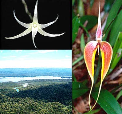 Hai trong số 30 giống lan mới phát hiện (từ trái qua): lan trắng hình ngôi sao 6 cánh; lan hình chim công với nhiều sắc màu: đỏ, vàng, trắng và tím sen. Một góc Hồ Kutubu. |