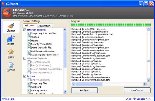 Để đảm bảo những thông tin cá nhân này không bị sử dụng trái phép thì bạn nên sử dụng công cụ miễn phí CCleaner. Công cụ cho phép bạn nhiều tùy chọn để xóa bỏ tất những thông tin cá nhân,những dấu vểt trên web như file temp,Cookies,history....Bạn có thể tải tại đây
