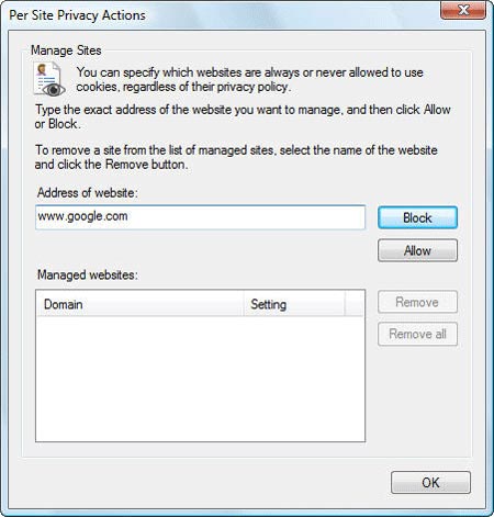 Giải pháp đơn giản hơn là chỉ loại bỏ Google trong vị trí đặt cookie trên máy tính. Muốn thực hiện điều này trong nhiều phiên trình duyệt, hay cho tất cả các trình duyệt, lấy ví dụ ở Internet Explorer 7, bạn vào Tools > Internet Options, bấm chọn tab Privacy > Sites. Trong ô “Address of website”, gõ www.google.com và kích Block. Từ bây giờ, mỗi lần ghé thăm Google, website này sẽ không được phép đặt cookie lên ổ cứng của bạn, và tất nhiên không thể theo dõi được hoạt động tìm kiếm.