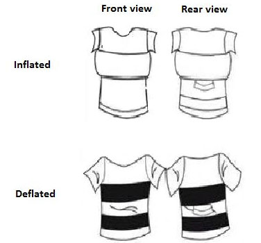 Để đạt được điều này, một chiếc phao được gắn vào lớp vải quấn quanh phần thân dưới cánh tay áo. Thiết bị báo động và ống chứa khí carbon dioxide (CO2) được đặt trong một chiếc túi nhỏ ở mặt sau áo phông. Ống khí CO2 được bịt kín bởi một cuộn cảm có khả năng phân hủy trong môi trường nước.