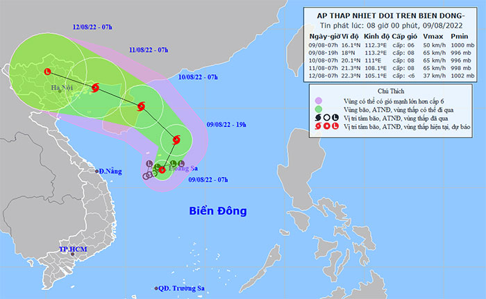 Sáng nay, 9-8, vị trí tâm áp thấp nhiệt đới (ATNĐ) ở ngay trên khu vực quần đảo Hoàng Sa với sức gió mạnh nhất vùng gần tâm ở cấp 6, giật cấp 8.