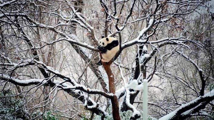 Một chú gấu trúc nằm nghỉ trên cây tại vườn thú sau trận tuyết rơi ở Bắc Kinh. (Ảnh: CNN)