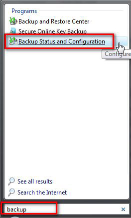 Ngoài ra, bạn có thể sử dụng hộp thoại tìm kiếm trên menu Start, nhập vào “backup” và kích vào shortcut Backup Status and Configuration.