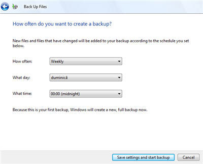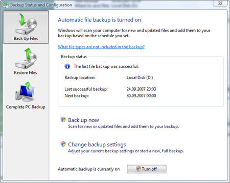 Nếu muốn tạo một bản backup mới, kích vào nút Backup now. Để thay đổi các thiết lập hiện tại, kích vào nút Change back up settings. Phải lưu ý là nếu muốn thay đổi thiết lập, bạn sẽ phải thực hiện tất cả các bước được mô tả trong phần trên: chọn các ổ, chọn loại file, kế hoạch lập lịch và cuối cùng bạn sẽ phải chọn nếu muốn tạo một backup mới hoặc lưu lại các thiết lập vừa sửa.