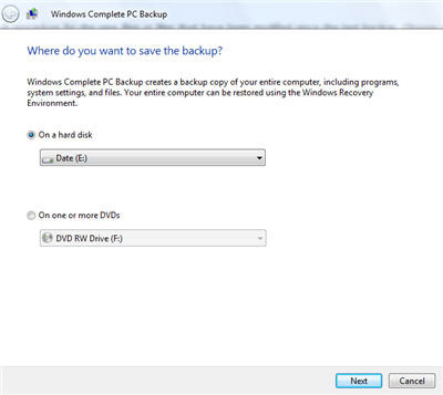 Chương trình sẽ bắt đầu và bạn sẽ được hỏi vị trí muốn lưu bản backup. Bạn có thể chọn một ổ cứng hoặc lưu vào đĩa CD/DVD. Đảm bảo rằng bạn có đủ CD/DVD hoặc dung lượng ổ cứng cần dùng, sau khi đã có những lựa chọn cần thiết, kích vào Next.