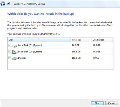 Trong cửa sổ tiếp bạn sẽ thấy một danh sách bao gồm toàn bộ các phân vùng ngoại trừ một phân vùng đã được chọn để xác định vị trí sẽ lưu file backup. Phân vùng mà Windows Vista đã được cài đặt sẽ được lựa chọn một cách mặc định. Giờ bạn có thể lựa chọn hoặc loại ra các phân vùng khác khỏi quy trình backup. Sau khi lựa chọn xong, kích vào Next.