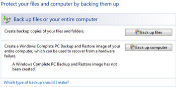 Trong phần trên (phần backup file) có hai tùy chọn: Back up files và Back up computer. Tùy chọn đầu tiên sẽ tạo backup của các file và thư mục cá nhân, còn tùy chọn thứ hai là tạo backup hoàn thiện cho toàn bộ hệ thống. Chúng tôi khuyên bạn nên tạo backup cho toàn bộ máy tính ngay sau khi cài đặt máy lần đầu. Windows Vista sẽ tạo một snapshot của toàn bộ các chương trình, các thiết lập và file trên máy tính. Bạn có thể sử dụng snapshot này nếu máy tính liên tục bị lỗi và khôi phục lại nó về tình trạng ban đầu.