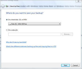 Trong cửa sổ Back Up Files bạn sẽ phải lựa chọn vị trí lưu bản backup. Bạn có thể chọn một phân vùng (ổ) từ ổ cứng, một đĩa CD, DVD hoặc một thư mục được chia sẻ trong mạng. Chọn vị trí thích hợp và kích vào Next