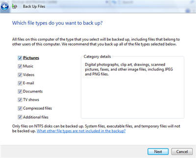 Chương trình sẽ hỏi bạn lựa chọn loại file muốn backup. Bạn có thể chọn bất kỳ file dạng nào: ảnh, nhạc, video, email, tài liệu tv shows, file nén hoặc file mới thêm. Sau khi lựa chọn xong loại file bạn muốn backup, kích vào Next.