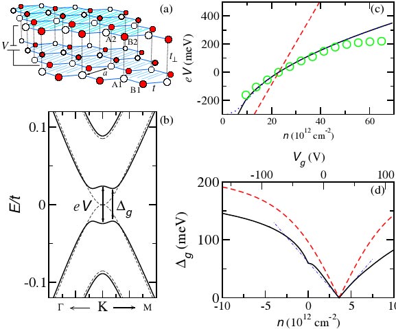 Hình 1. Lớp đôi graphen (a) và sự phụ thuộc của độ rộng khe năng lượng vào mật độ hạt dẫn và phụ thuộc vào điện trường ngoài (d) (Phys. Rev. Lett.99 216802). |