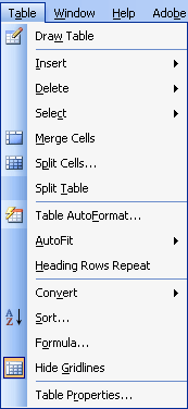 | - Draw table: Vẽ bảng - Insert: Chèn bảng - Delete: Xóa - Select: Lựa chọn (bôi đen) - Merge Cells: Nhập ô - Split Cells: Chia ô - Split Table: Chia bảng - Table AutoFormat…: Định dạng bảng theo kiểu có sẵn - AutoFit: Tự động co giãn hảng - Heading Rows Repeat: Đặt dòng đầu trong bảng làm tiêu đề bảng cho những trang sau. - Convert: Chuyển đổi - Sort…: Sắp xếp - Formula…: Công thức tính toán trong bảng - Hide Gridlines: Ẩn/hiện đường viền bảng - Table Properties: Xem thuộc tính bảng. | ![]() |