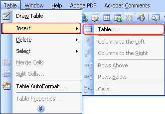 1. Vào Table / Insert / Table…