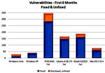 Còn số lỗi chưa được vá của Vista chỉ nhiều hơn so với Windows XP và ít hơn OS X, nhiều nhất là RHEL4, SLED10, Ubuntu. Ví dụ: hãng Red Hat phải sửa 281 lỗi của hệ điều hành Enterprise Linux 4 trong 6 tháng đầu tiên phát hành, còn Microsoft chỉ phải sửa 12 lỗi cho Vista.