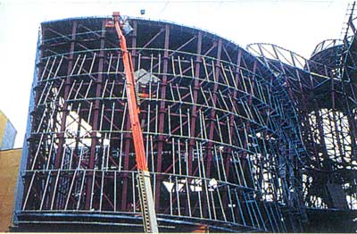 Nổi lên từ những bề mặt kiểm soát này, xây dựng một vùng kết cấu. Khung thép giằng, gồm các mặt cắt liên kết kiểu bích mép rộng nằm trên một kết cấu mắt lưới 3m, rất dễ thực hiện. Hầu hết thành phần là những mặt cắt thẳng, và tính co dãn của hình dáng chung đạt được hoàn toàn bằng các mối nối. Giữa khung nhiều mặt của thép sơ cấp và các bề mặt kiểm soát là hai lớp cấu trúc thứ cấp, bên trong và bên ngoài. Các thang nằm ngang làm bằng ống thép, đường kính 60mm tọa ra độ cong theo phương nằm ngang.