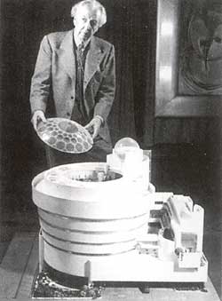 | Frank Lloyd Wright cùng mô hình bảo tàng viện do ông thiết kế, với phần nắp đậy bằng kính. |