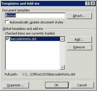 Nếu add-ins không tự khởi động cùng Word thì bạn chọn menu Tools > Templates and Add-Ins > trong hộp thoại Templates and Add-Ins bạn nhấn nút Add để chọn tập tin BarcodeWorks.dot rồi nhấn OK.