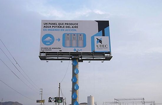 Trường Đại học Kỹ thuật và Công nghệ (UTEC) ở Lime, Peru đã “bắt tay” với công ty quảng cáo Mayo Publicidad để sáng tạo ra một loại biển quảng cáo có khả năng tích tụ hơi nước trong không khí và chuyển thành nước uống tinh khiết.