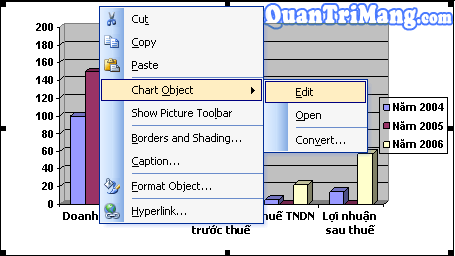 6. Muốn vào sửa đổi nội dung & kiểu dáng biểu đồ: Kích đúp vào biểu đồ. Hoặc kích chuột phải vào biểu đồ, chọn Chart Object \ Edit: