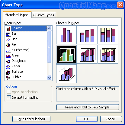 - Chọn nút Set as default chart nếu muốn để kiểu biểu đồ đã chọn sẽ được dùng cho những lần vẽ biểu đồ sau.3. Bạn có thể chọn thẻ Custom types để chọn 1 số loại biểu đồ khác
