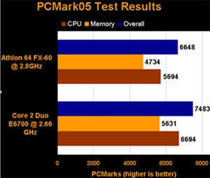 Chương trình thử nghiệm PCMark05 gồm một bộ tiêu chuẩn đánh giá tổng hợp, mỗi chuẩn đánh giá được thiết kế để kiểm tra một hệ thống phụ độc lập như bộ nhớ, bộ vi xử lý và ổ cứng. Thử nghiệm này sẽ tự động phát hiện bộ vi xử lý mà bạn đang dùng và tải những thư viện động được tối ưu hóa cho bộ vi xử lý khi thử nghiệm ở từng chức năng. Một bộ vi xử lý Athlon 64 có thể tinh chỉnh bảng mã hóa để chạy tốt nhất trên kiến trúc của mình trong khi một bộ vi xử lý Pentium 4 chạy cùng một thử nghiệm có thể chạy nhiều bảng mã hóa khác nhau được tối ưu hóa cho bộ vi xử lý đó. Rất nhiều các thử nghiệm đủ nhỏ để vừa với dung lượng bộ nhớ đệm L2 của các bộ vi xử lý mới, vì vậy những thử nghiệm đó nếu chạy với tốc độ xung nhịp cao hơn sẽ có kết quả tốt hơn. Đó là một cái nhìn lý tưởng về hiệu suất hoạt động. Trong thế giới thực, các tối ưu hóa ứng dụng có thể sẽ rất khác nhau. PCMark05 không có bất cứ tính năng tối ưu hóa nào cụ thể cho nền tảng vi kiến trúc Core vì nền tảng này vẫn chưa công bố khi PCMark05 được phát triển. Mặc dù vậy, điểm đánh giá lại rất ấn tượng. Bộ vi xử lý Core 2 Duo E6700 có tốc độ thấp hơn nhưng lại có điểm PCMark tổng thể và hiệu suất hoạt động của bộ vi xử lý tốt hơn bộ vi xử lý FX-60 đã được đôn xung. Chúng tôi không quá tin vào các điểm của bộ nhớ do hệ thống thử nghiệm của Intel sử dụng bộ nhớ DDR2 trong khi hệ thống thử nghiệm của AMD lại sử dụng bộ nhớ DDR. Hiện tại, các bộ vi xử lý của AMD đã hỗ trợ hoàn toàn bộ nhớ DDR2.