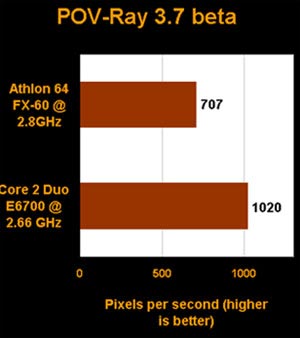 Phiên bản 3.7 của công cụ chồng hình mã nguồn mở POV-Ray hỗ trợ khả năng xử lý đa luồng và các lệnh SSE. Chúng tôi kích hoạt lựa chọn “all CPUs” (Tất cả các bộ vi xử lý) trong chương trình POV-Ray với phiên bản beta mới nhất (phiên bản 13) và ghi lại kết quả về Pixels Per Second (PPS-số lượng pixel trên mỗi giây). Hiệu suất hoạt động được cải thiện 44% với bộ vi xử lý Core 2 Duo so với một hệ thống gần giống hệ thống FX-62 đắt hơn (nếu như AMD không giảm giá quá nhiều).