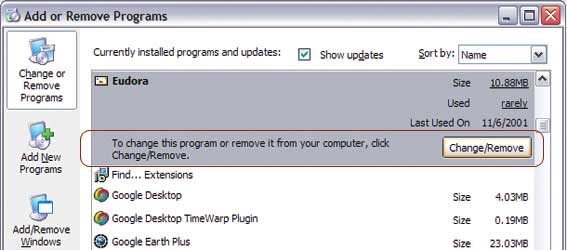 Bạn có thể gỡ bỏ các ứng dụng một cách an toàn bằng cách sử dụng công cụ Add or Remove Programs của Control Panel. Tuy nhiên, nếu chương trình đó đi kèm khả năng tự gỡ bỏ cài đặt (uninstall) thì bạn nên sử dụng tính năng này. Đặt trường hợp chương trình đó vẫn xuất hiện trong cửa sổ Add or Remove Programs sau khi đã thực hiện các bước trên, hay nếu không hỗ trợ tính năng tự gỡ bỏ cài đặt thì bạn hãy tìm chương trình đó trong danh sách ở mục "Currently installed programs". Sau đó nhấn chuột vào nút Remove or Change/Remove và thực hiện theo hướng dẫn. Một vài chương trình bảo mật chỉ có tùy chọn "Change", đòi hỏi việc gỡ bỏ cài đặt phải được thực hiện bằng chính công cụ đi kèm chương trình.