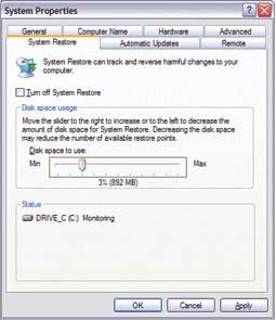Một ứng dụng khác chiếm khá nhiều không gian đĩa cứng là System Restore của Windows. Để hạn chế sự phí phạm này, nhấn phải chuột lên biểu tượng My Computer, chọn Properties > System Restore, kéo thanh trượt xuống mức 3% (hay thấp hơn) rồi nhấn OK.