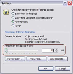 Để cắt giảm sự phí phạm đĩa cứng này, nhấn Tools > Internet Options, chọn Settings ở thẻ General và điều chỉnh thanh trượt xuống mức 20GB hay 30GB chẳng hạn (hay bạn cũng có thể tăng con số này lên để tăng tốc khi duyệt web với kết nối quay số). Nhấn OK hai lần để kết thúc.