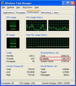 Kiểm tra cách sử dụng RAM của máy tính bằng cách mở Windows Task Manager. Nhấn Ctrl-Alt-Del (người dùng Vista phải click vào Start Task Manager) và click vào Performance tab. Nếu con số bên cạnh 'Available' (hoặc 'Free' trong Vista) dưới phần 'Physical Memory' dao động gần 0 thì máy tính của bạn hoạt động rất chậm và nó cần phải thêm RAM.