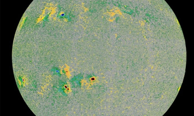 Hình ảnh bên dưới là bản đồ mới về từ trường của Mặt trời, cũng từ PHI. Nó hé lộ từ trường đặc biệt mạnh và tập trung ở khu vực vết đen. Điều này giúp giải thích tại sao vết đen mát hơn xung quanh. Từ trường cực mạnh tại đó hạn chế quá trình đối lưu thông thường của plasma, buộc vật chất phải di chuyển theo từ trường. Kết quả là một phần nhiệt lượng không thể truyền tới bề mặt, khiến vệt đen mát hơn những nơi khác trên bề mặt Mặt trời, theo Daniel Müller, nhà khoa học dự án Solar Orbiter của ESA.
