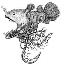 Vì ở đáy biển sâu mồi ăn rất khan hiếm, nên để tăng cơ hội tóm được nhiều mồi, con cái được "trời phú" cho một cơ quan phát sáng. "Cá phát sáng" cứ việc vẩy vẩy "cần câu đóm sáng" ngay trước miệng của nó để dụ dỗ những con mồi ngây thơ. Khi thời cơ "chín muồi" nó chỉ việc há rộng mồm, nuốt lấy toàn bộ con mồi.