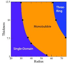 | Hình 2. Giản đồ pha khả năng xuất hiện các bọt tương ứng với bán kính chấm nano và độ dày của chấm (Phys. Rev. B 76 (2007) 104426). |