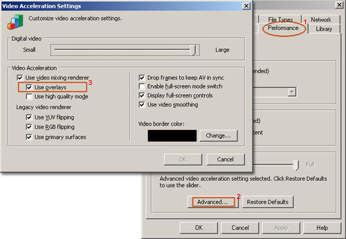 - Trong hộp thoại Video Acceleration Settings, bạn hãy bỏ dấu kiểm ở hộp Use overlays (3) (trong khung Video Acceleration) rồi bấm OK để đóng các hộp thoại lại.