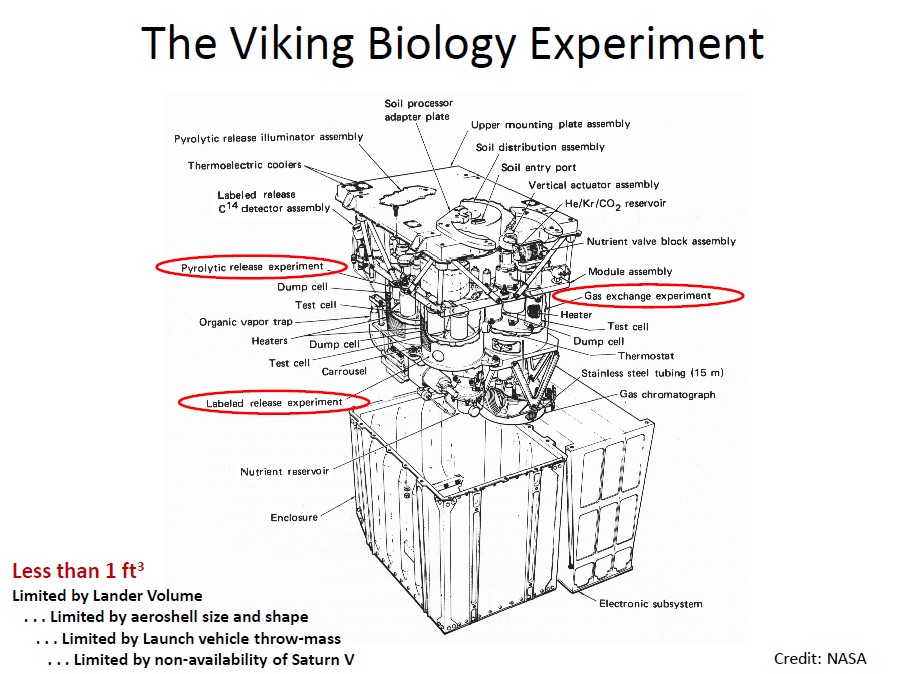 Tàu NASA Viking đổ bộ trên Mars đã tiến hành cuộc tìm kiếm này vào mùa hè năm 1976. Viking gồm hai bộ tàu quỹ đạo và tàu đổ bộ giống hệt nhau, với các buồng thí nghiệm trên tàu đổ bộ để tiến hành ba thí nghiệm sinh học.