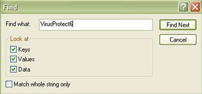 Bên khung trái của Registry Editor, bạn tìm đến phần trên cùng là My Computer, trên thanh menu Edit, chọn Find, bạn gõ "VirusProtect6", xóa tất cả các khóa chứa chuỗi này. Tiếp tục thao tác trên với từ khóa tìm là "933187C5788574F4889B3B1FBB35638A".