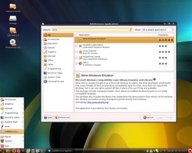 Sau đó đóng terminal lại, chuyến đến phần Applications - Add/Remove. Tại đây, bạn chọn vào tùy chọn "All available applications" ở phía trên bên phải của cửa sổ, tìm đến Wine và cài đặt nó. Cài đặt xong, bạn đóng cửa sổ lại.