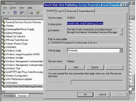 3. Trong World Wide Web Publishing Server Properties dialog box, xác nhận Startup type là Automatic, và trang thái vận hành của service là Started.