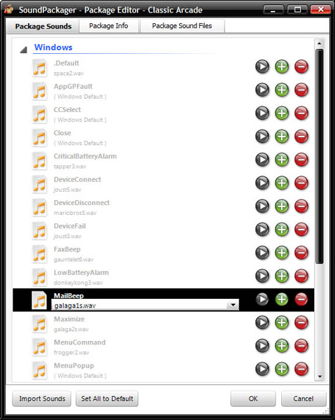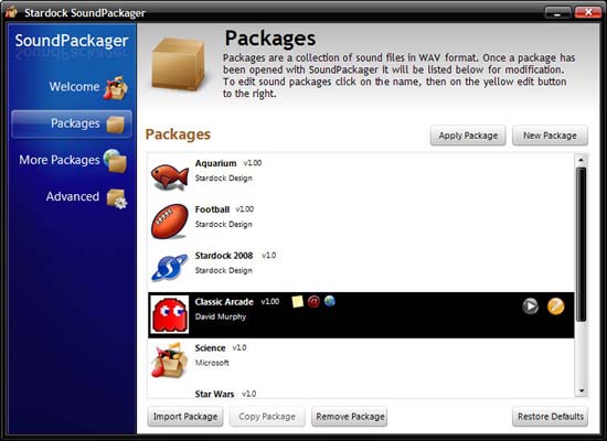Nếu IconPackager cho phép bạn tải lên các gói single-file để thay thế cho tất cả các biểu tượng thì cũng khá hiển nhiên về những gì SoundPackager cần thực hiện. Giao diện có đôi chút khác biệt trong thành phần này vì không cần nhiều đến việc hiển thị.
