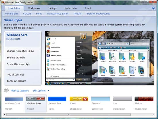 WindowBlinds cho bạn khả năng sử dụng "skins" cho Windows (cả Windows XP và Vista). Các skin này cho phép bạn thay đổi diện mạo cơ bản của các cửa sổ trong Windows – ví dụ như tiêu đề thanh ba, các đường viền, nút và thanh cuộn, nút cửa sổ, menu Start, Sidebar và đặt lại tên cho nó.