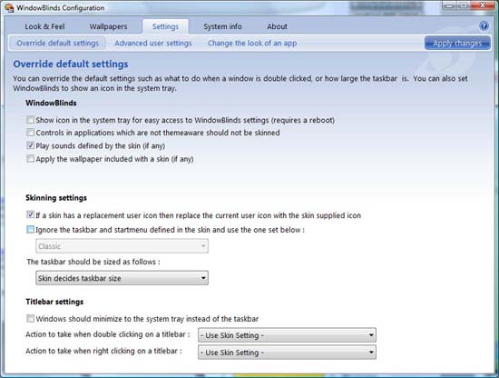 Chương trình cấu hình là sự thay đổi rõ dệt nhất. Nó có nhiều giao diện hấp dẫn và trực giác hơn cho việc chọn skin của WindowsBlinds và điều chỉnh các tùy chọn. Nhiều skin cho phép bạn điều chỉnh màu, cho phép bạn có thể thực hiện giống như bỏ qua hoặc sử dụng các thiết lập đã được định nghĩa trong skin cho âm thanh, tiêu đề thanh, kích thước thanh công cụ, các thiết lập sidebar và,… và hàng trăm skin có sẵn miễn phí được cung cấp từ WinCustomize.com.